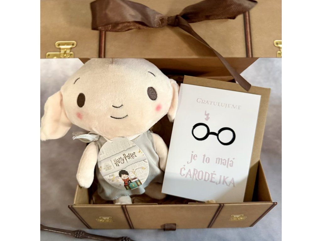Sada obsahuje originálny Rokfortský kufrík s mašľou, plyšáka Dobbyho (24 cm, extra jemný plyš) a narozeninové prianie pre malú čarodejnicu. Na prianie možno prianie pripraviť aj v angličtine.