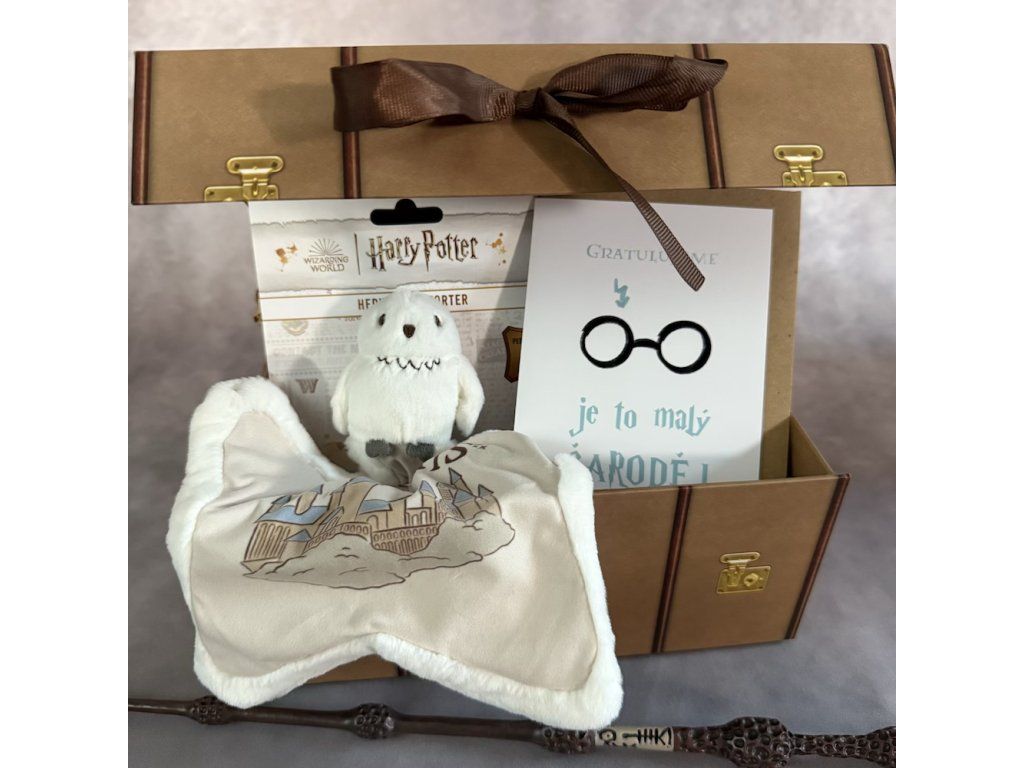 Sada obsahuje originálny Rokfortský kufrík s mašľou, hebký muchláček s motívom sovy Hedvigy a narozeninové prianie s nápisom Blahoželáme, je to malý čarodejník. Na prianie možno prianie pripraviť aj v angličtine.