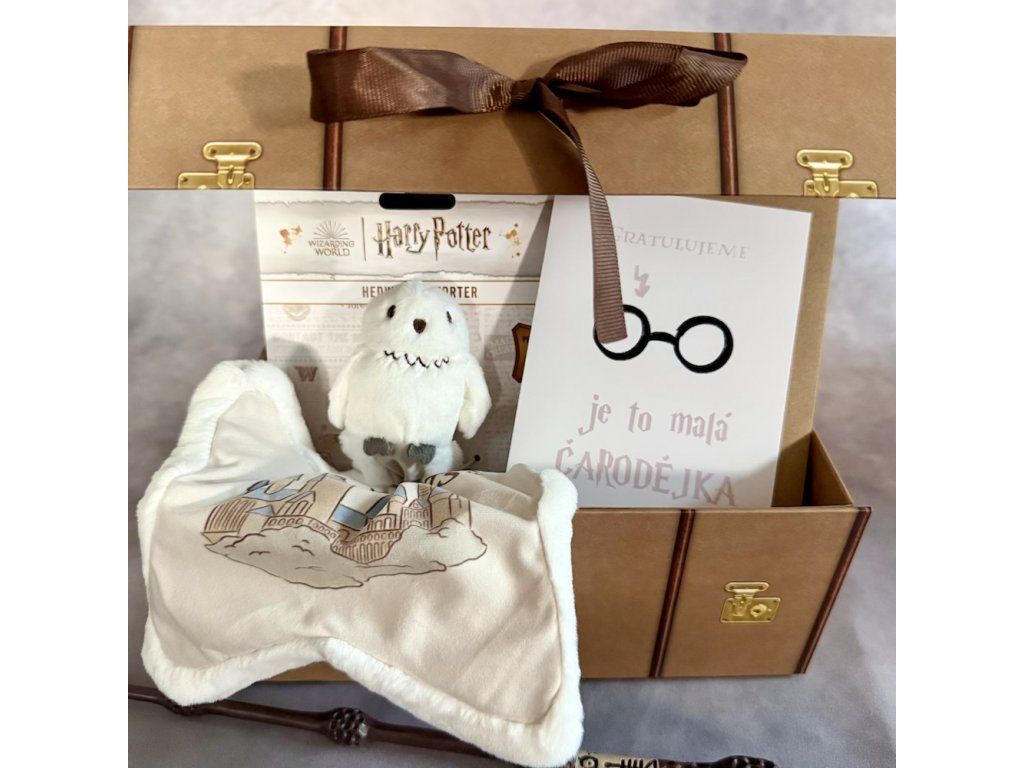 Harry Potter darčeková sada muchláček Hedviga Narodila sa čarodejnica — Rokfortský kufrík (24×22×10 cm), hebký muchláček Hedviga a prianie. Vhodné od narodenia. Expedícia do 24 hodín na Svetkuziel.sk.
