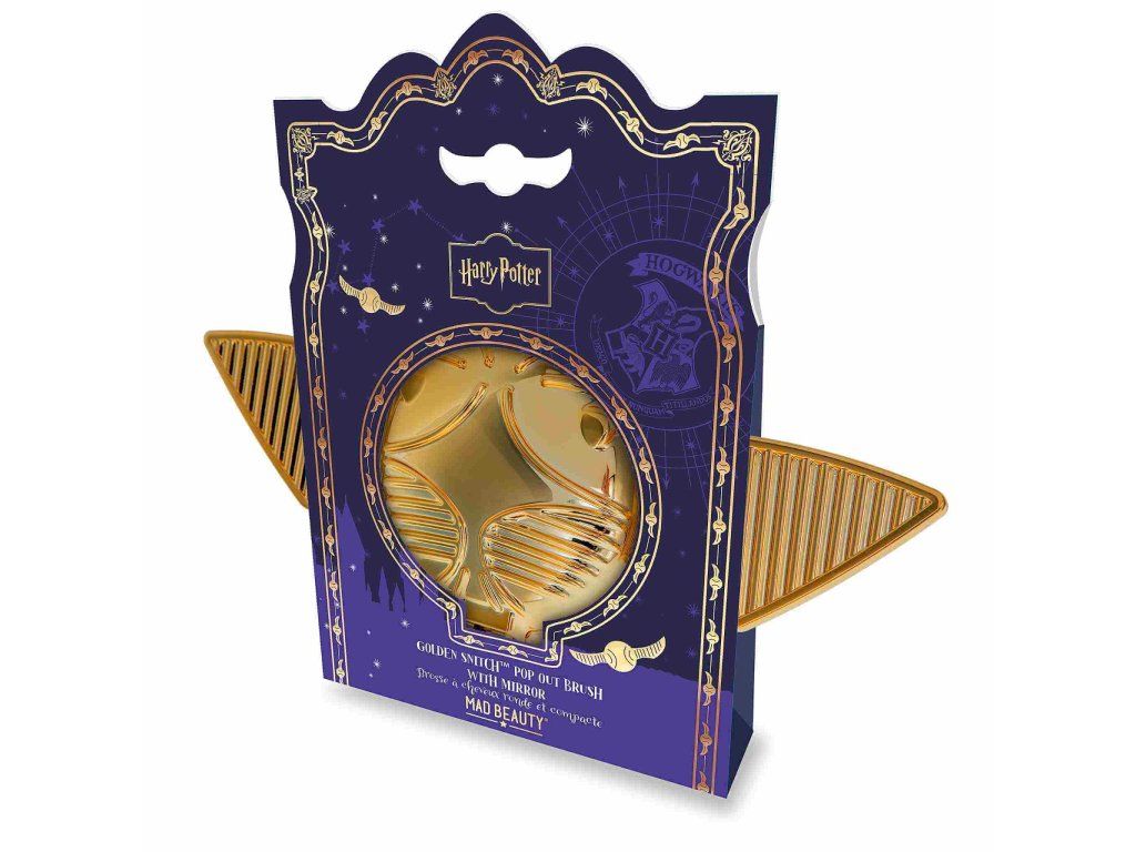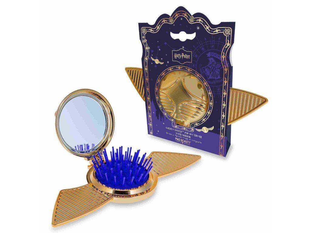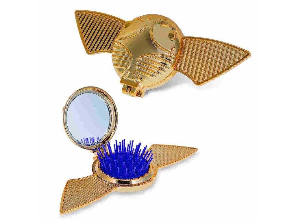 Harry Potter skladacia kefa na vlasy Zlatá strela — so zrkadlom vo vnútri, kompaktná veľkosť do kabelky. Motív Zlatej strely z Metlobalu. Oficálna licencia Warner Bros. Expedícia do 24 hodín na Svetkuziel.sk.