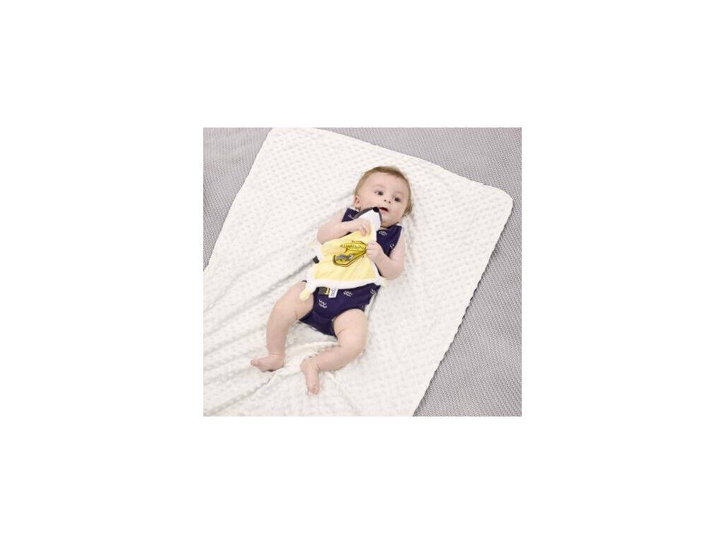 Rozmery muchláčka sú 34 × 34 × 4,5 cm — plochý tvar je ideálny pre najmenšie deti do postieľky aj kočíka.