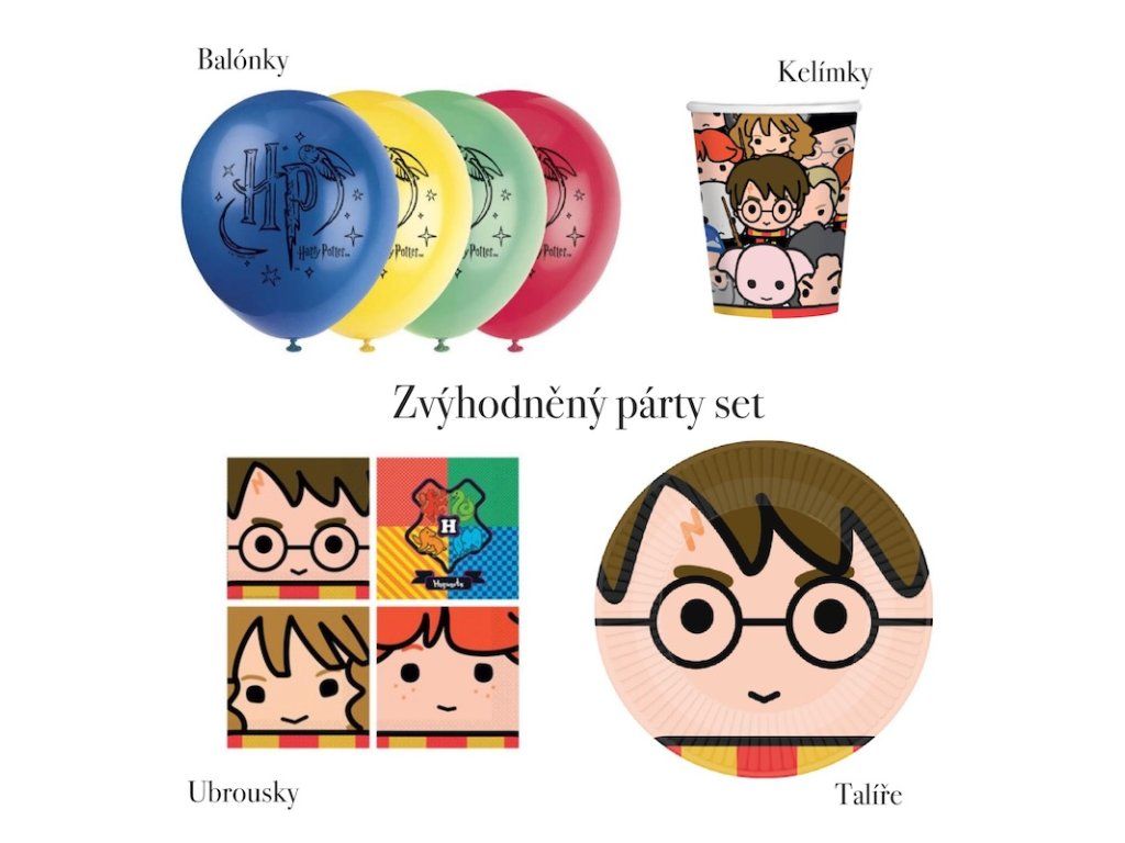 Set má motív kúzelných postáv - taniere s Harrym, poháriky s postavami, obrúsky s Harrym/Ronom/Hermionou a balóniky s logom HP.