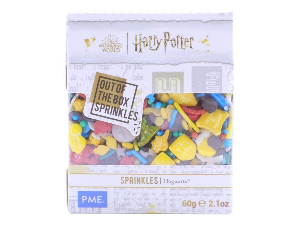 Jedlé cukrové posypky v motívoch Triediaceho klobúka, sovy Hedvigy, Nástupišťa 9 a ¾, erbov Rokfortských fakúlt, Harryho brýlí a ďalších HP symbolov. Balenie 60 g v zatvárateľnej krabičke.