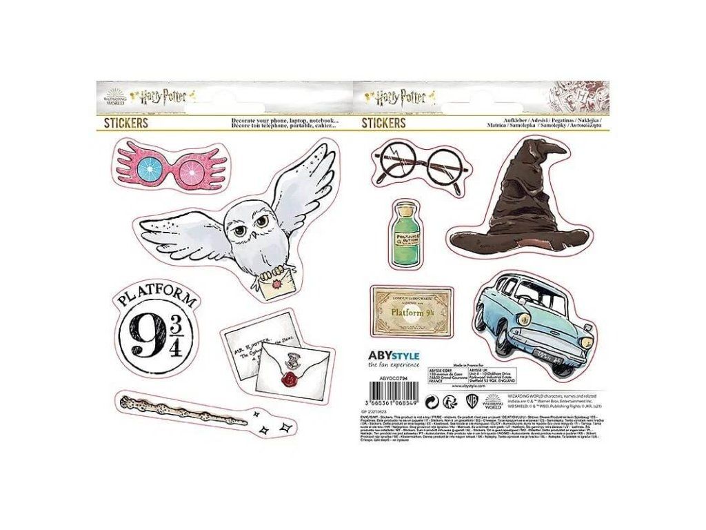 Sada obsahuje 10 kusov samolepiek v 2 hárkoch s motívmi magických predmetov zo sveta HP — Triediaci klobúk, Strašibrýle Luny Lovegoodovej, lietajúce auto Ford Anglia a ďalšie. Oficálna licencia Warner Bros.