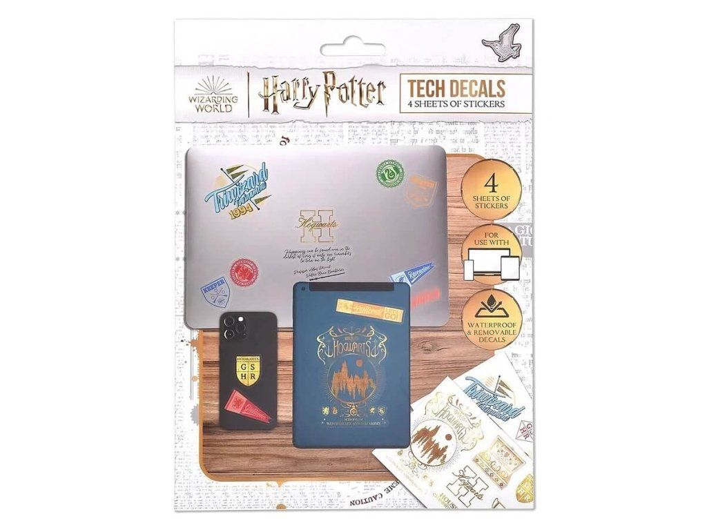 Sada obsahuje 4 hárky vodoodolných vinylových samolepiek s motívmi z Rokfortu — erby fakúlt, silueta Rokfortu, Metlobal a ďalšie kúzelnícke motívy. Oficálna licencia Warner Bros.