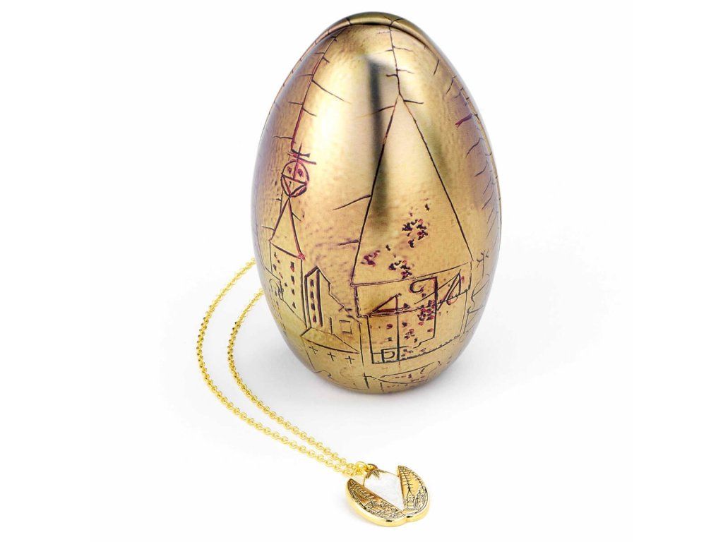 Plechová krabička v tvare Zlatého vajca z Turnaja troch čarodejníkov je viac než len obal — je to tri veci v jednom. Po otvorení nájdete vnútri pozlátený náhrdelník s prívescom pripravený na nosenie. Vajco možno vďaka otvoru a priloženej maši zavesiť ako originálnu Veľkonočnú alebo Vianočnú ozdobu. A tretia možnosť? Nasypte do otvoreného vajca čokoládové vajíčka zo sady a máte rozkošný kúzelnícky Veľkonočný košíček — originálna prezentácia darčeka, ktorá nadchne každého fanúšika.